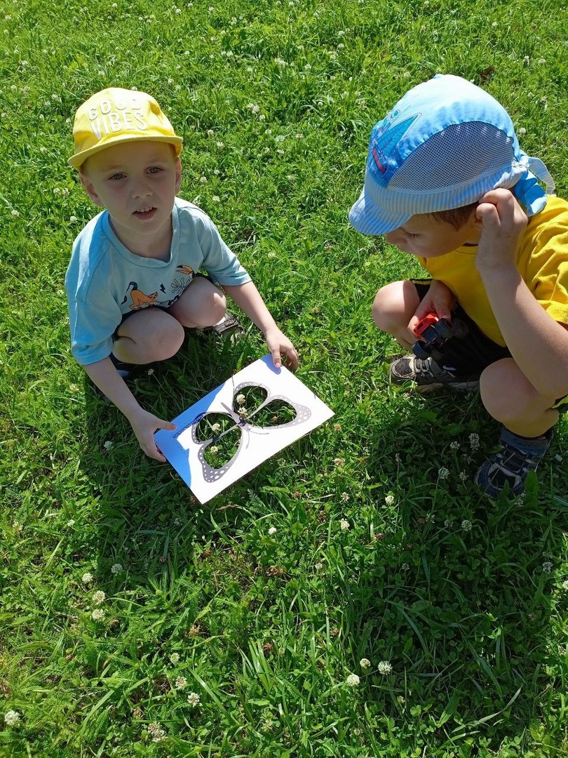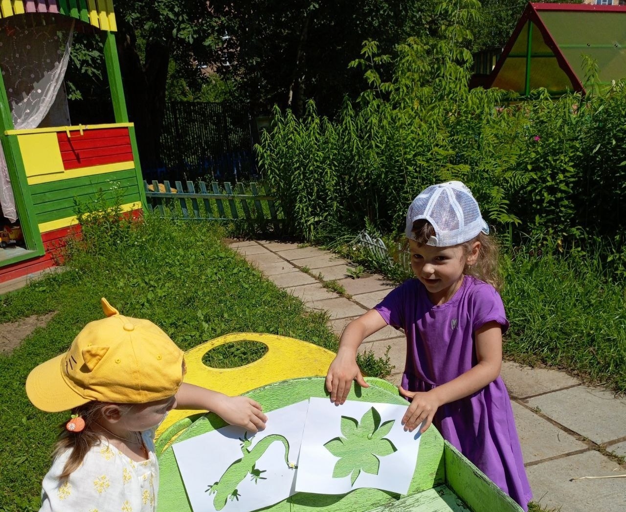 Дети групп "Винни-Пух" и "Лучики" вели наблюдения на участке детского сада, используя сделанные руками воспитателя трафареты.